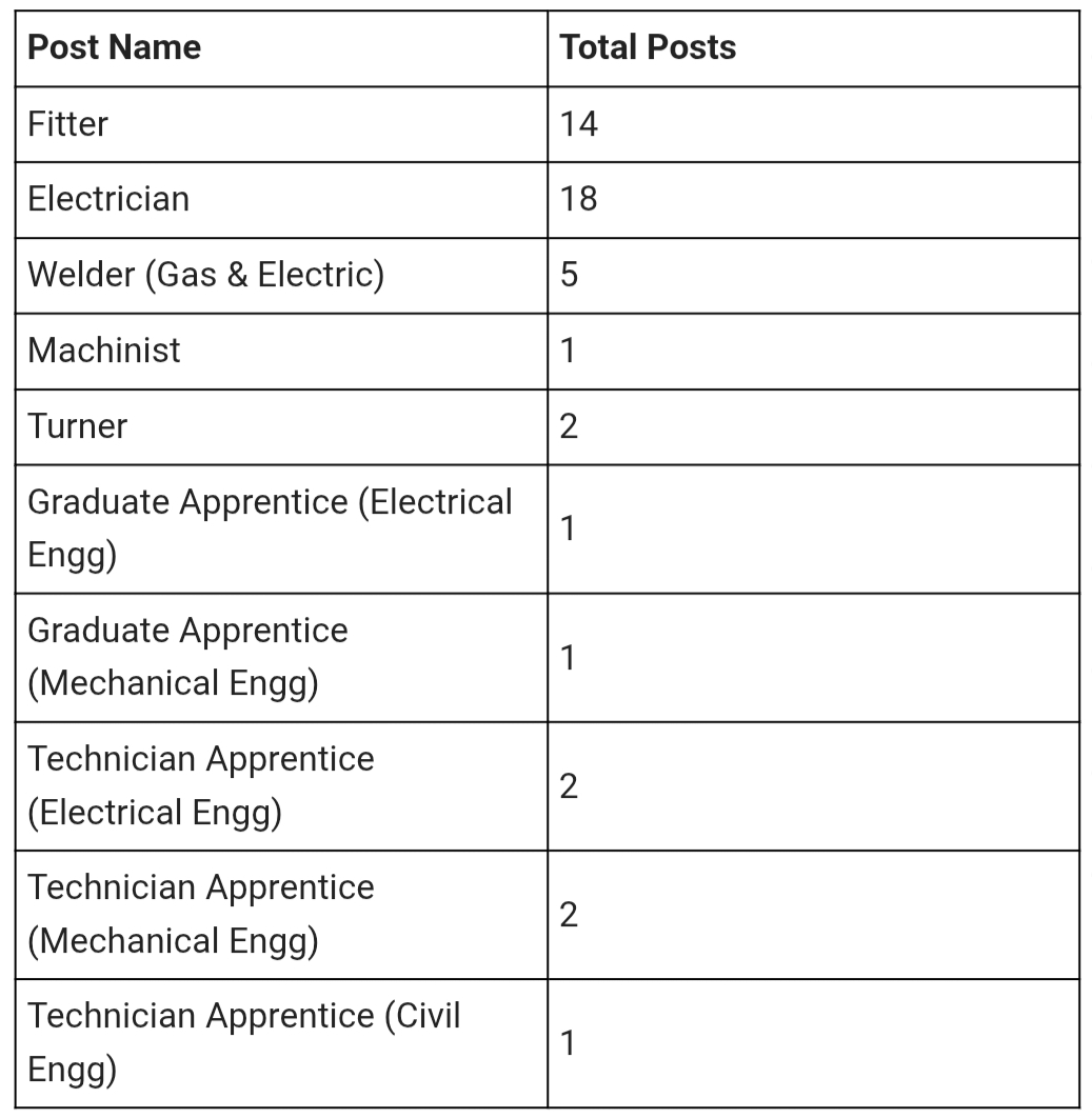 - Trade Apprentice: High School passed with specified percentage (General/OBC: 60% or more, SC/ST: 55% or more). ITI passed from NCVT/SCVT recognized institute between 2023-2025 as regular candidate in relevant trade.