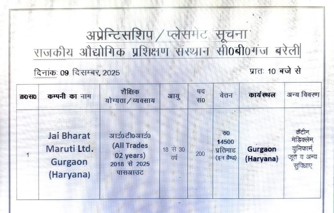 Jai Bharat Maruti Campus Placement 2025 | Freshers | Trainee | ITI Pass | December 2025 |