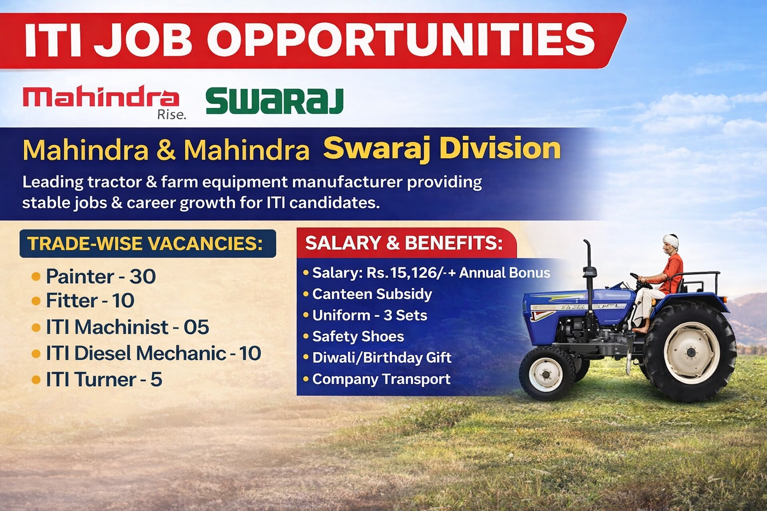 Mahindra & Mahindra Ltd. – Swaraj Division is one of India’s leading tractor and farm equipment manufacturers. The Swaraj brand is well known for its strong engineering, reliability, and farmer-focused innovation. The company offers stable employment, skill development, and long-term career growth opportunities for ITI and technical candidates in the manufacturing sector.