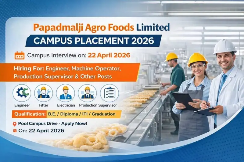 Papadmalji Agro Foods Limited Campus Placement 2026: Papadmalji Agro Foods Limited is conducting a Pool Campus Drive for recruiting Engineer, Machine Operator, Production Supervisor and other posts at Government Polytechnic College, Bikaner. Candidates having B.E., Diploma, ITI or Graduation qualifications can participate in the campus interview scheduled on 22 April 2026. The detailed eligibility and selection process are explained below.