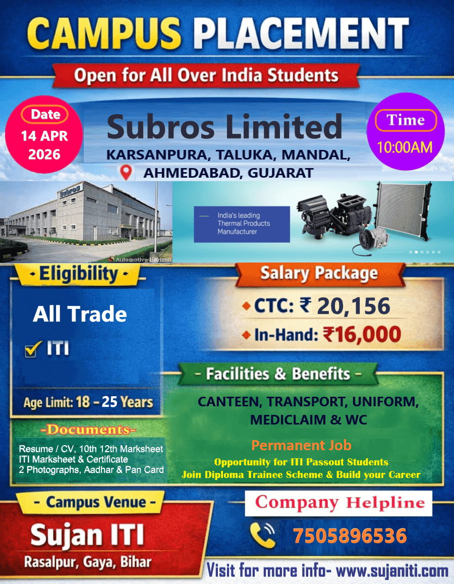 Subros Limited Campus Placement 2026: Subros Limited has released a notification for recruiting Trainee posts through a campus placement drive. Candidates having ITI qualifications (All Trades) can attend the campus placement drive scheduled on 14 April 2026. The detailed eligibility and selection process are explained below.